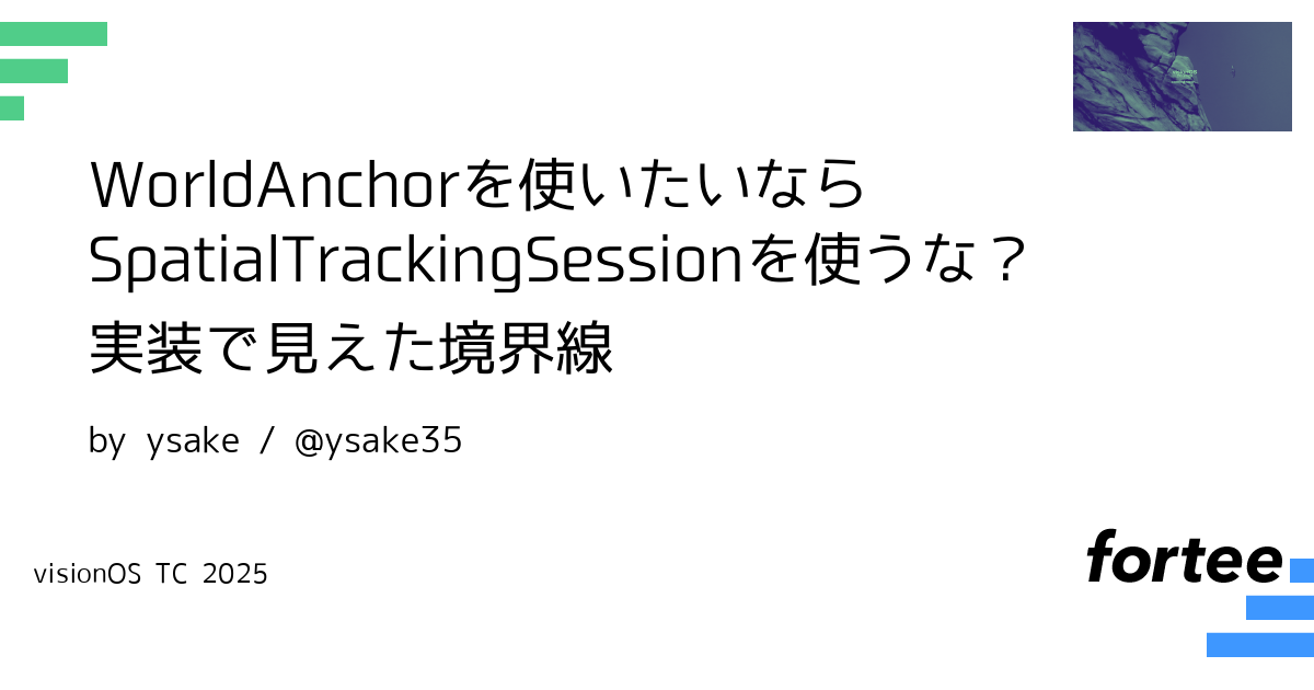 本セッションでは、fusen開発で得た知見をもとに、RealityKitとARKitの設計思想、.worldトラッキングの役割、そして現時点での安定構成を実機検証と公式情報で解説します。