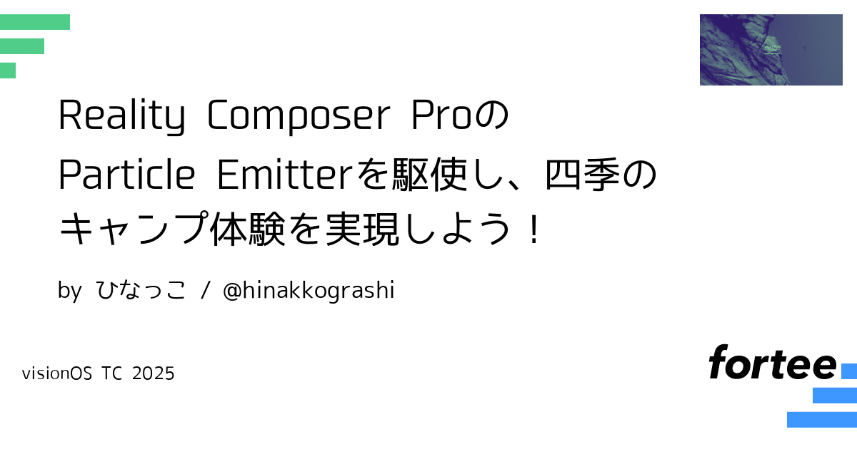 本LTでは、Reality Composer Proを用いてvisionOSアプリに「春夏秋冬」の季節感を演出するParticle Emitterを作成・実装する実践的な方法を紹介します。